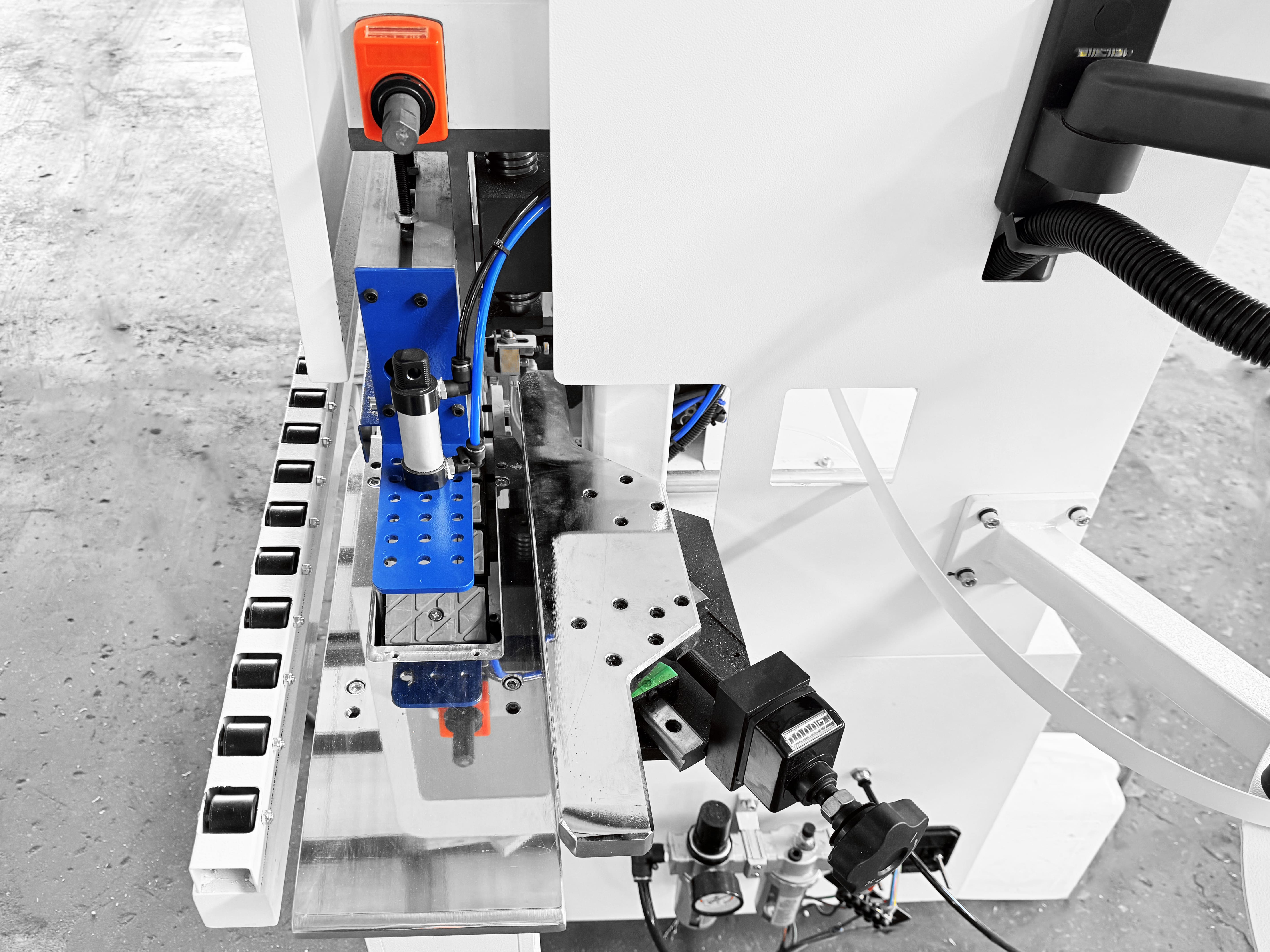 Прижимной блок с пневматическим управлением оснащен одним основным и двумя допрессовочными роликами со скребками, давление на ролики может регулироваться в зависимости от типа используемой кромки и деталей. Каждый ролик оснащен индивидуальным пневмоцилиндром.