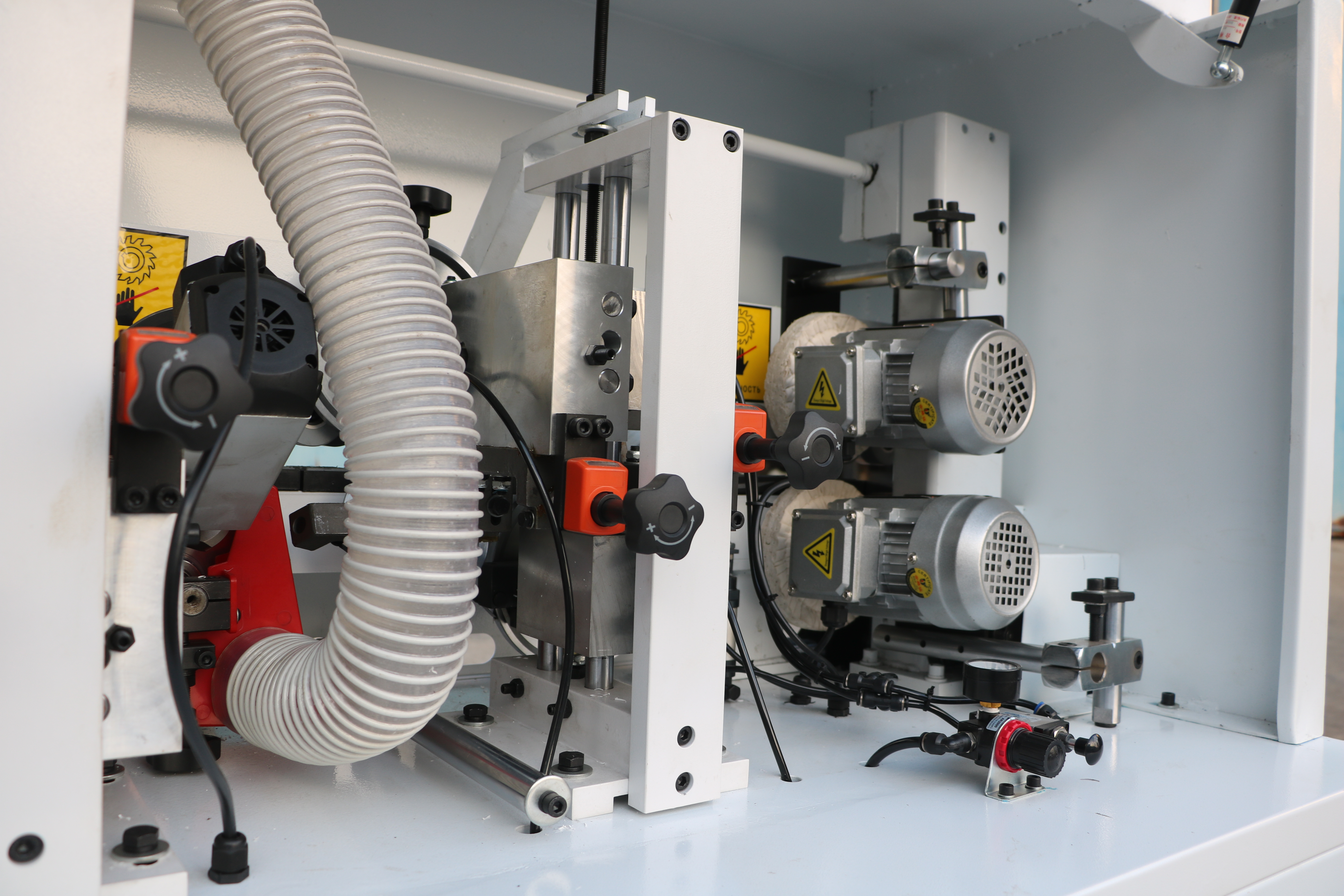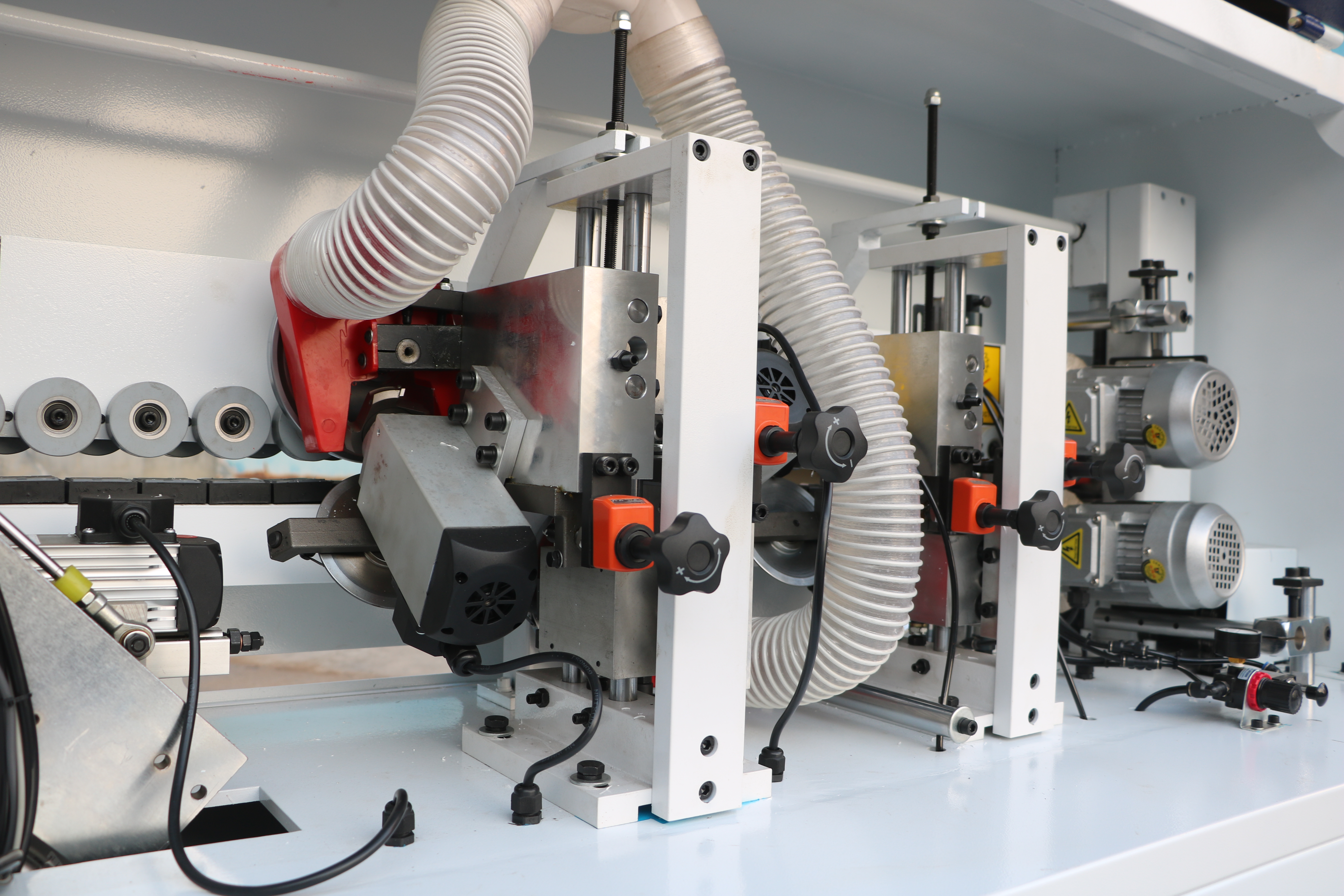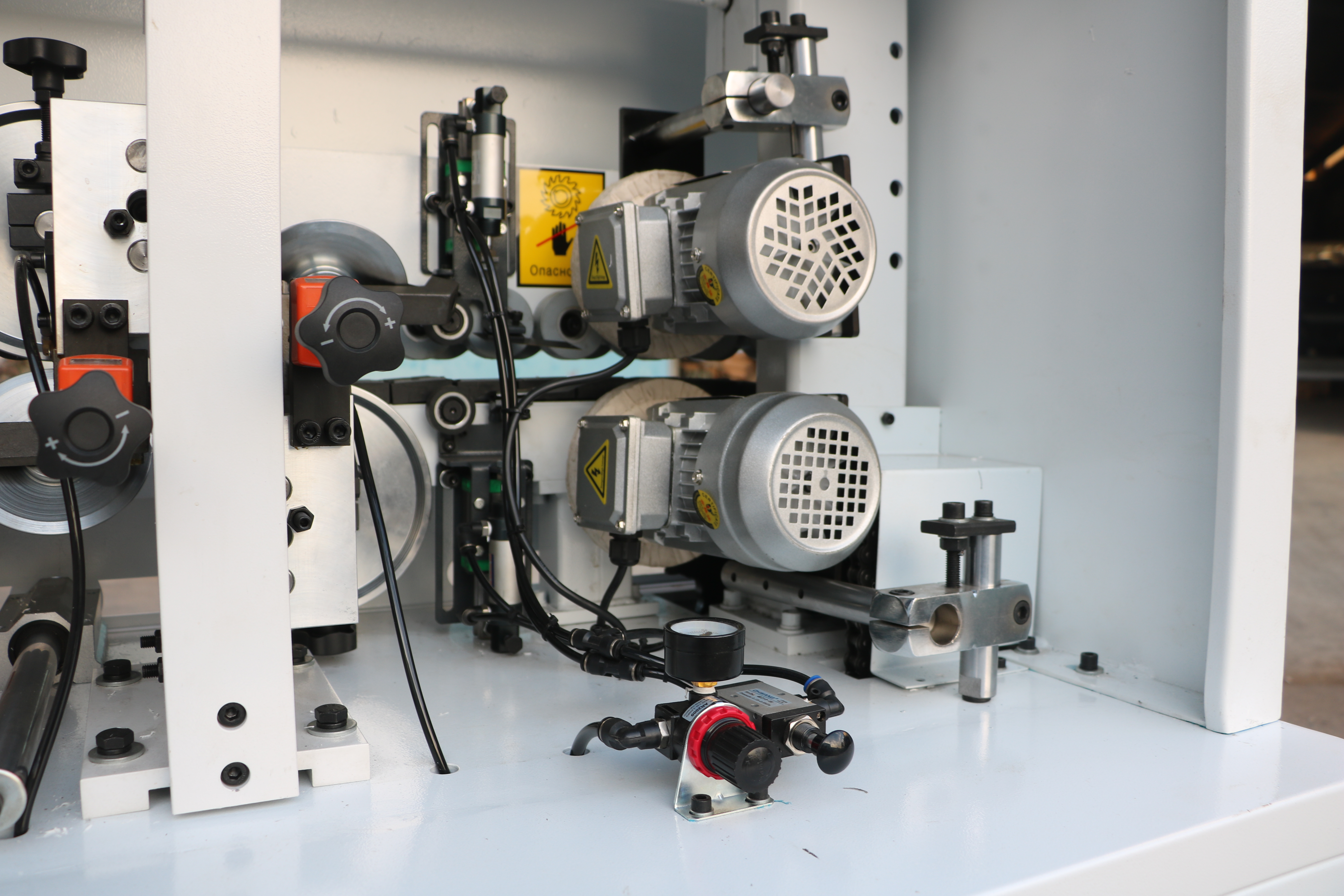 Прижимной блок с пневматическим управлением оснащен одним основным и одним полноценным допрессовочным роликом, давление на ролики может регулироваться в зависимости от типа используемой кромки и деталей.