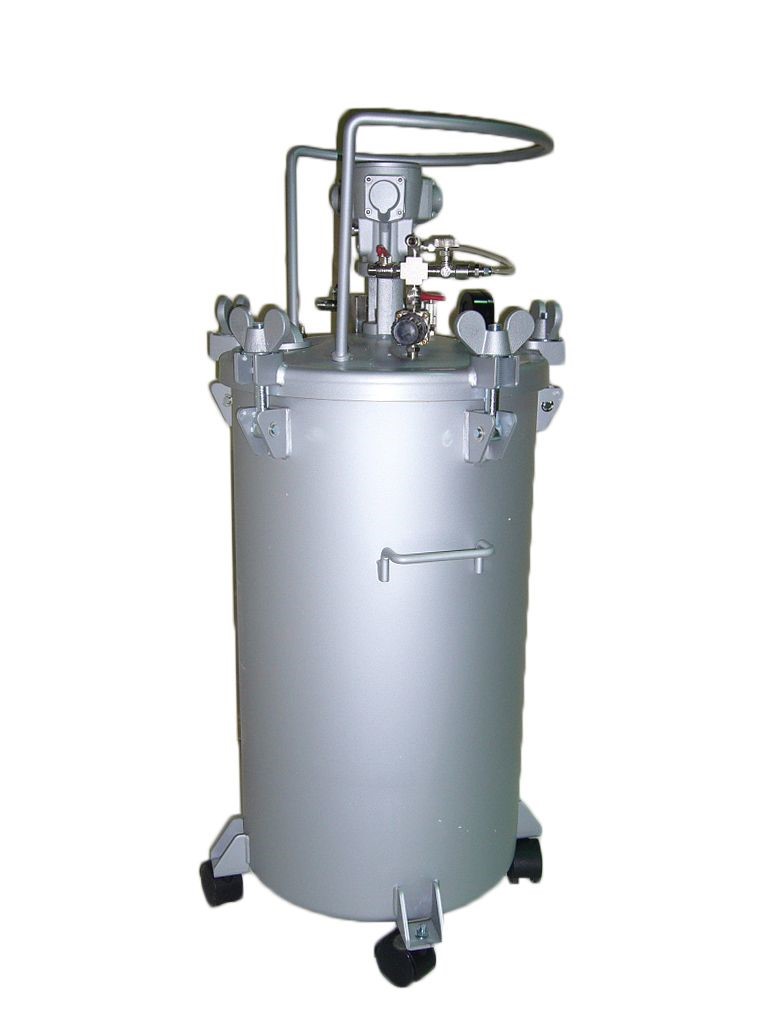 Клеенагнетательные баки применяются для приготовления, постоянного перемешивания (если необходимо) и дальнейшей подачей ЛКМ, а так же различных дисперсных Клеев (ПВА, ПУР) в пистолет-распылитель. Они оснащены удобными регуляторами для настройки необходимого давления окрасочного материала и безопасными клапанами сброса давления. Ручные и пневматические мешалки обеспечивают высокое качество смесей. Баки изготовлены из высококачественных материалов и соответствуют всем мировым и европейским требованиям, предъявляемым к оборудованию, работающему под высоким давлением (PED, ATEX и ASME).