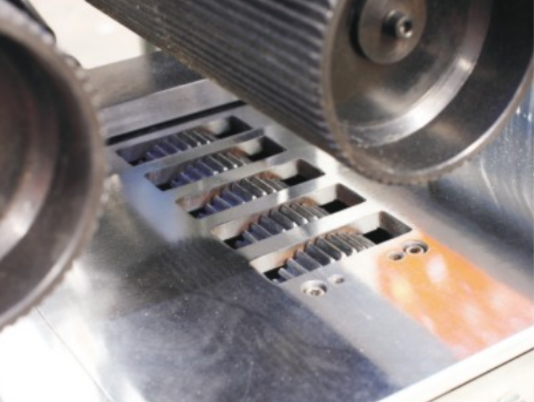Механизм подачи состоит из верхних и нижних стальных роликов. Рифленые ролики на входе и обрезиненные на выходе, приводятся в движение системой карданных приводов и редукторов. Рифленые ролики обеспечивают стабильную подачу, а обрезиненные ролики на выходе не оставят никаких следов даже на самых мягких породах древесины.