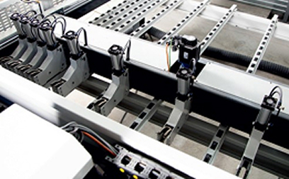 Специальная конструкция захватов не повреждает материал при его фиксации и перемещении. Конструкция захватов с двухточечным зажимом надежно фиксирует и деликатно перемещает материал в течение всего цикла раскроя.