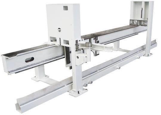 Узел перемещается по двум стальным круглым направляющим с помощью серводвигателя и передачи шестерня - рейка. Такая схема гарантирует максимальную скорость холостого хода, плавность подачи каретки при рабочем ходе и стабильность качества раскроя.