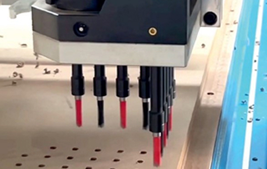 Сверлильная группа на 9 независимых инструментов по оси X и Y позволяет производить плоскостную присадку с высокой точностью и скоростью.