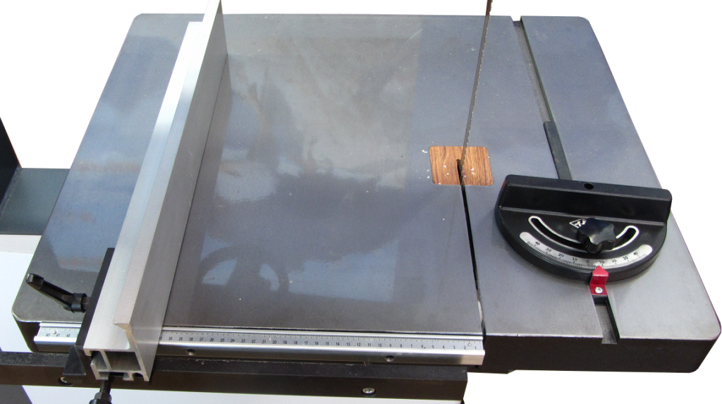 Чугунный стол Массивный рабочий стол из серого чугуна. Направляющая линейка на столе настраивается по миллиметровой шкале. Толкатель с угловой шкалой для удобства подачи заготовок. |