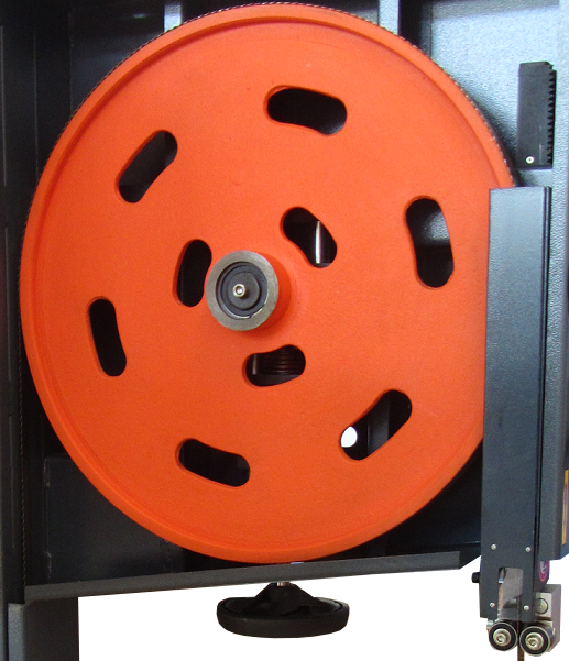 Чугунные шкивы Литые шкивы из серого чугуна, в отличие от алюминиевых шкивов, обладают большой массой и инерцией, поэтому не снижается их скорость и пила ведет себя стабильно при резании, особенно при входе в заготовку. Каждый шкив проходит балансировку. На нижнем шкиве щетка для очистки от опилок. |