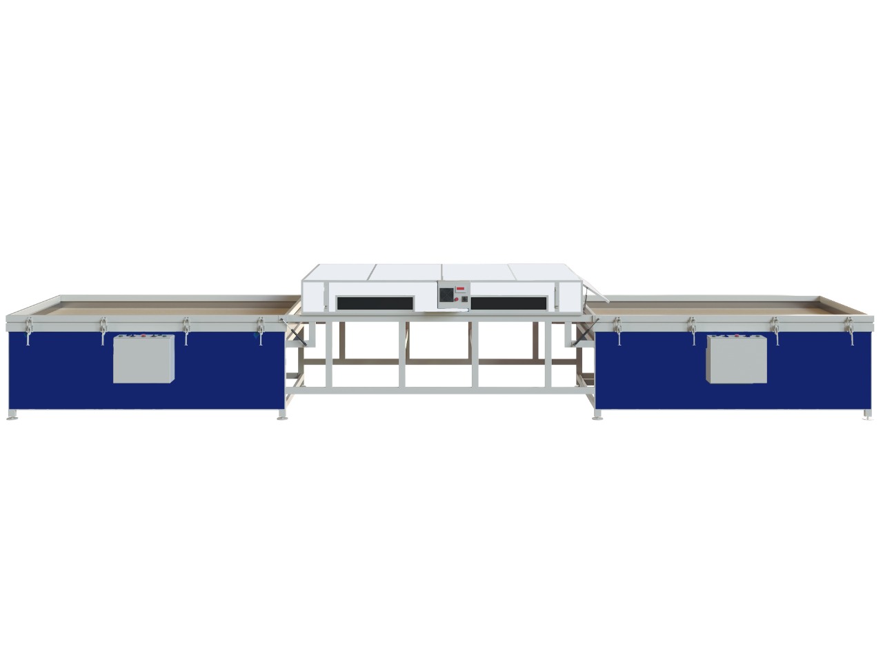 Откатной термомодуль оборудован специальными роликами и перемещается между двумя рабочими столами через "зону покоя" легко и без усилий. В конце пути с обеих сторон имеются ограничители хода с отбойниками. В термомодуле имеются откидные боковые створки. Перемещение термомодуля происходит легко, оператору не потребуется прилагать усилий для данной процедуры. Доступ к рабочему столу в данной модификации имеется со всех 4-х сторон, в отличии от вакуумного пресса с откидным термомодулем.