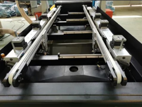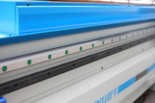 Станина станка выполнена из толстостенного метала с большим количеством продольных и поперечных ребер жесткости, что обеспечивают стабильную работу и превосходную виброустойчивость станка. Механическая обработка монтажных плоскостей производится на портальном обрабатывающем центре производства Тайвань. Допуск на прямолинейность монтажной поверхности направляющей рейки/стойки после механической обработки составляет ≤0,02 мм (по всей длине). Корпус станины и портал дважды обрабатывается на обрабатывающем центре: (1) Операция фрезерования + сверление (2) снятие технологической фаски + нарезание резьбы + тонкое фрезерование, что обеспечивает идеальную сборку и безупречную точность в работе станка.
