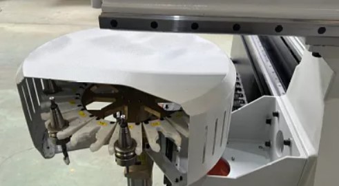 Система автоматической смены инструмента с тарельчатым магазином на 12 патронов. Максимальный диаметр хвостовика инструмента под цангу ER32 до 20 мм. Данная система, в отличие от линейной системы смены инструмента располагается непосредственно на портале, что обеспечивает быстроту смены инструмента в среднем на 50% быстрее, чем при использовании линейного.
