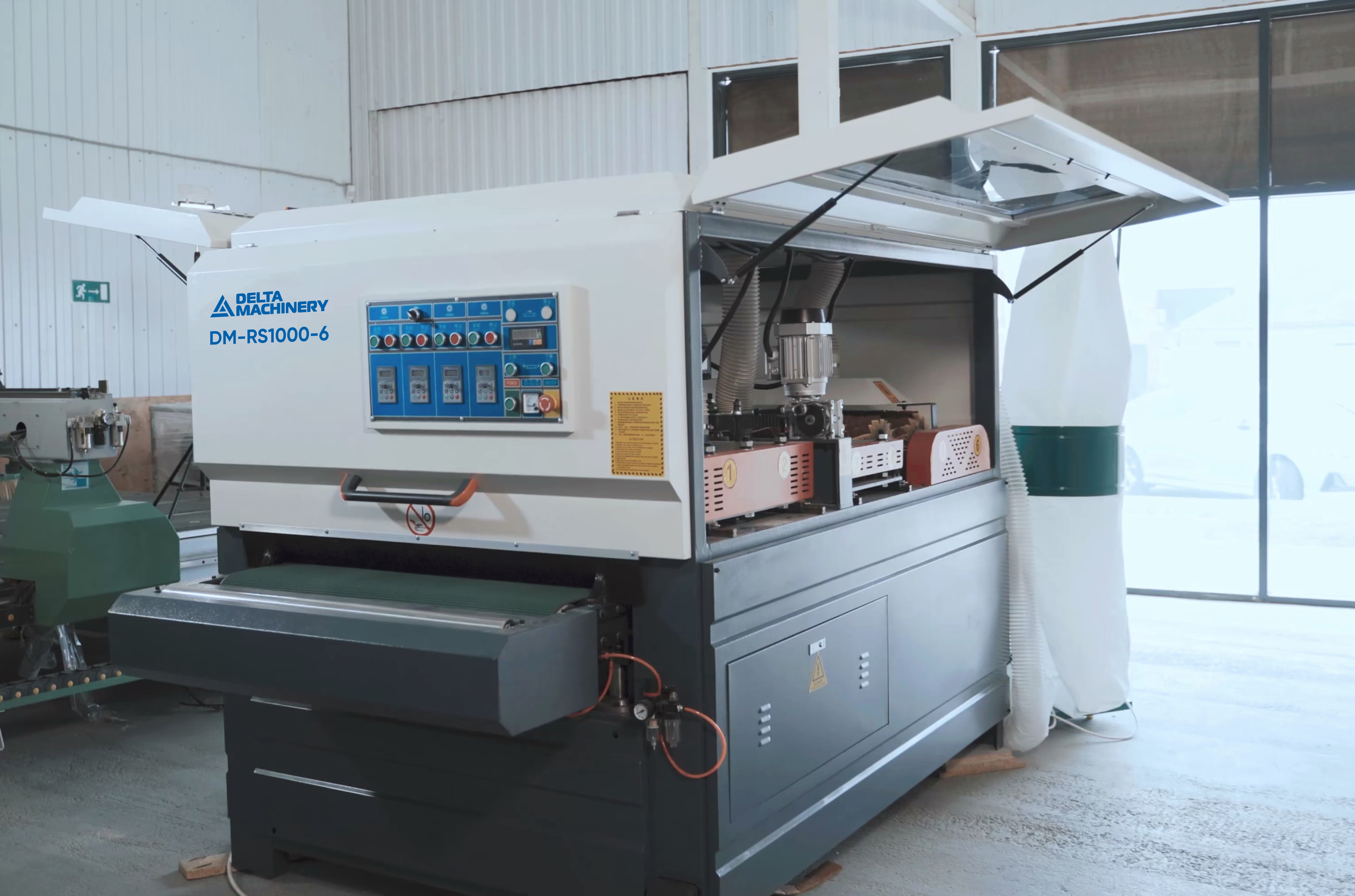 Финишным этапом обработки является продольный шлифовальный блок (два барабана во всю ширину рабочего стола, с щетками расположенными по спирали)