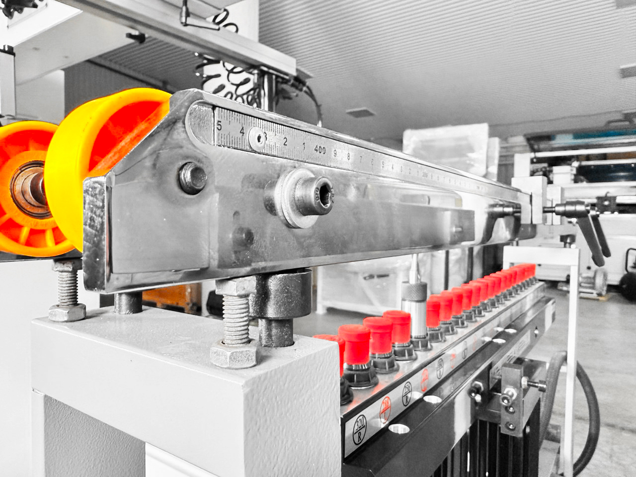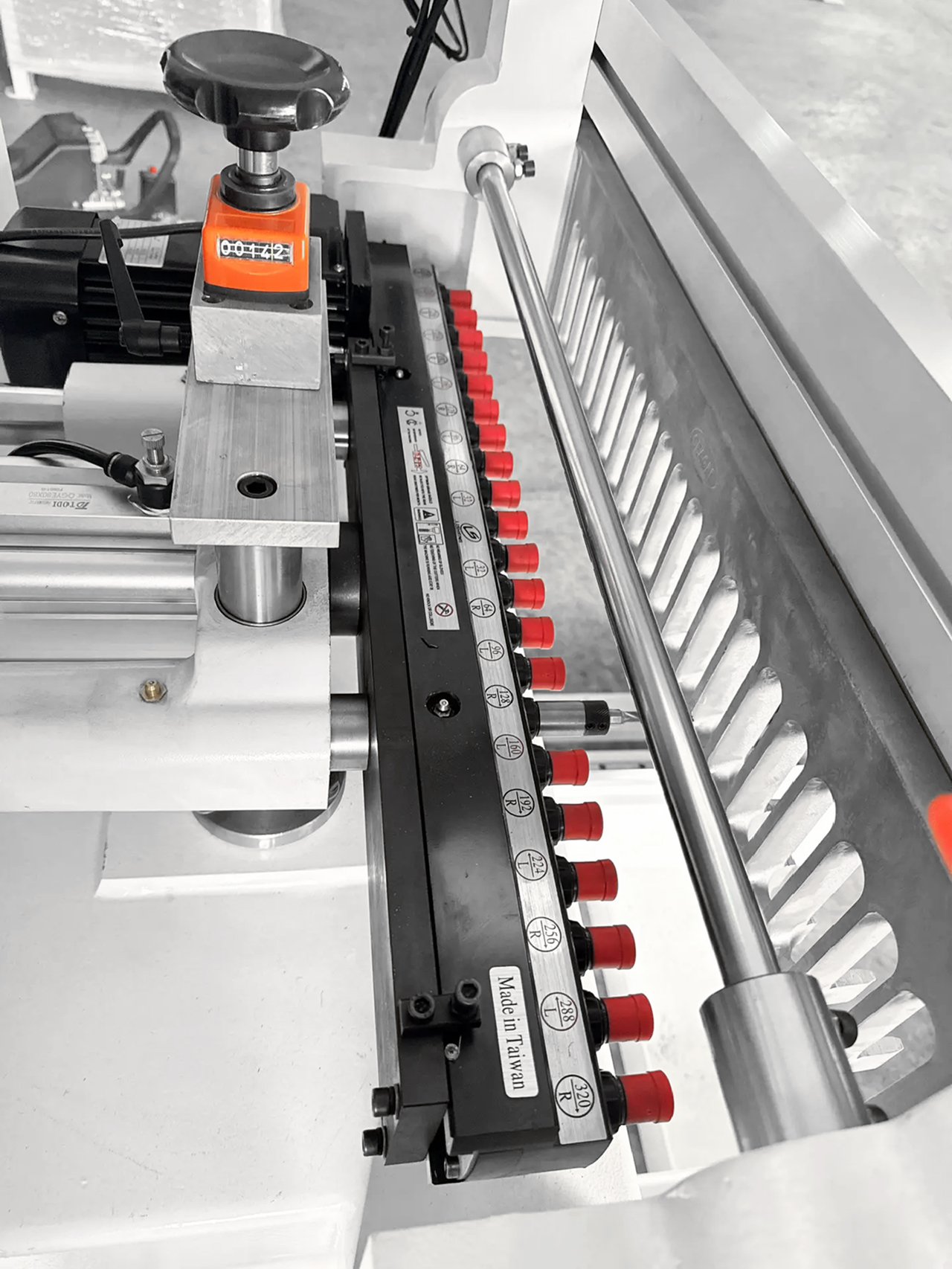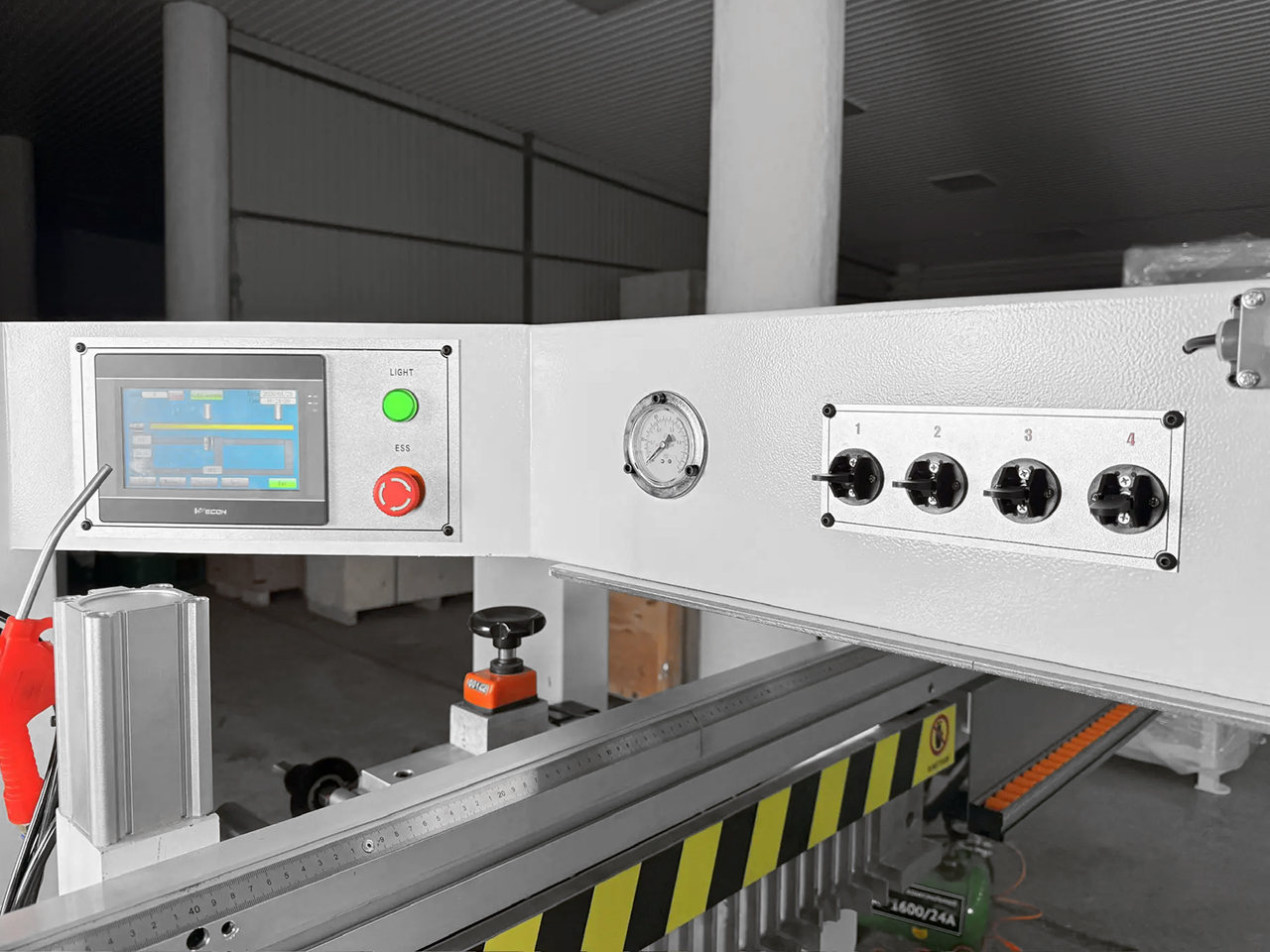 За позиционирование детали по глубине отвечают 4 пневматических упора, выбор необходимых упоров производится с помощью переключателей на центральной панели, что значительно сокращает время позиционирования детали и сокращает время присадки.