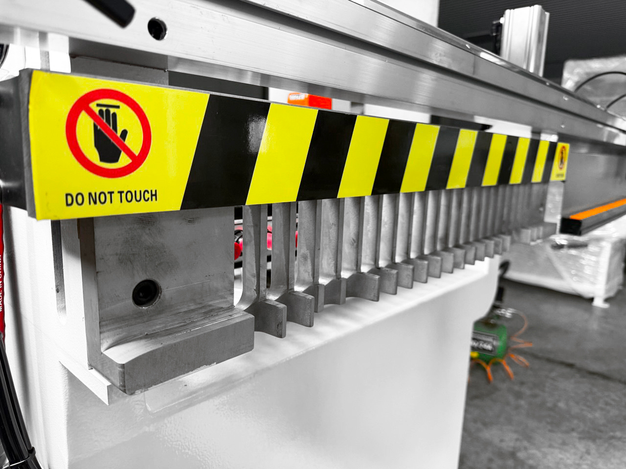 Для обеспечения дополнительной безопасности при работах, на передней части станка, по всей ширине рабочего места оператора проложен аварийный торс отключения станка, это поможет избежать травм или брака при возникновении нештатной ситуации. Оператор всегда сможет быстро произвести аварийное отключение.