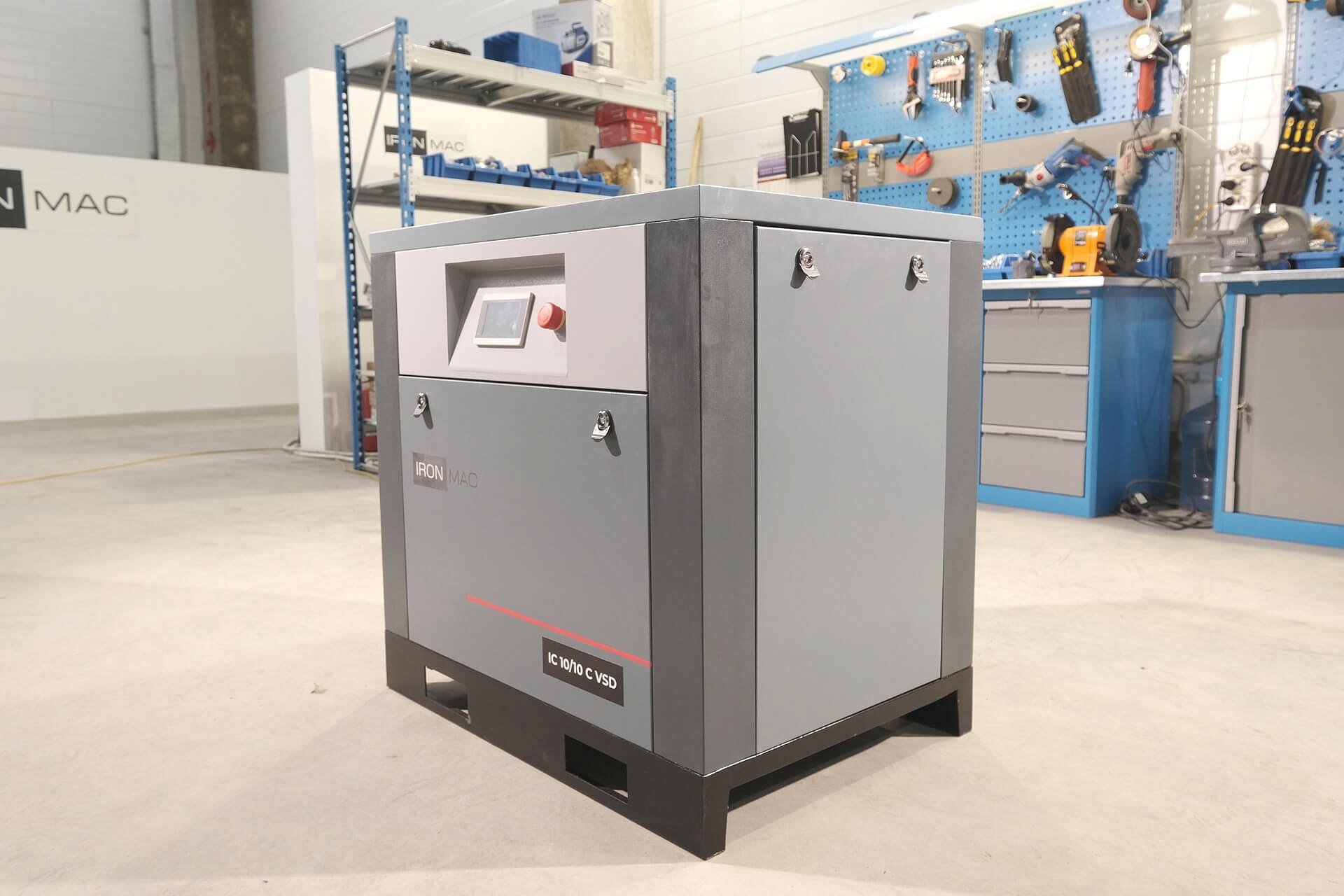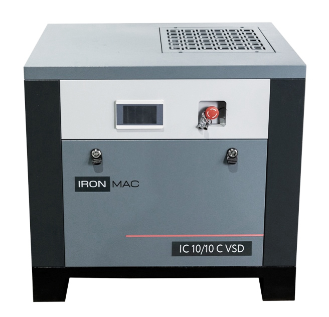 Винтовой компрессор IronMac IC C VSD IP 23 из профессиональной линейки, собран на прочной стальной раме. Компрессор предназначен для малых и средних предприятий, а все узлы конструкции фиксируются к жесткому основанию и дополнительно изолируются от вибраций. На серии C VSD реализована система прямого привода, а двигатель имеет уровень защиты по классу IP 23 с высокой степенью эффективности отведения тепла.