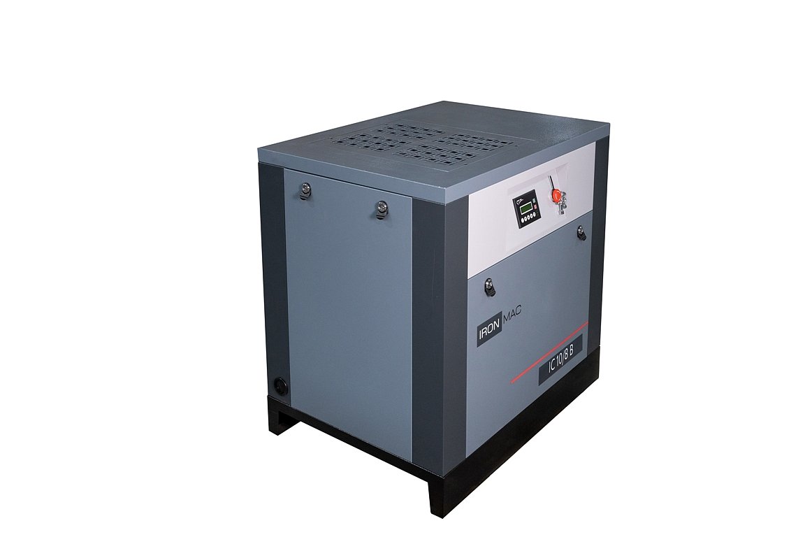 Винтовой компрессор IronMac IC B из основной линейки, собран на прочной стальной раме. Компрессор предназначен для малых и средних предприятий, а все узлы конструкции фиксируются к жесткому основанию и дополнительно изолируются от вибраций. На серии IC B реализована система ременного привода через клиновые ремни, а двигатель имеет уровень защиты от IP 23 до IP 55.